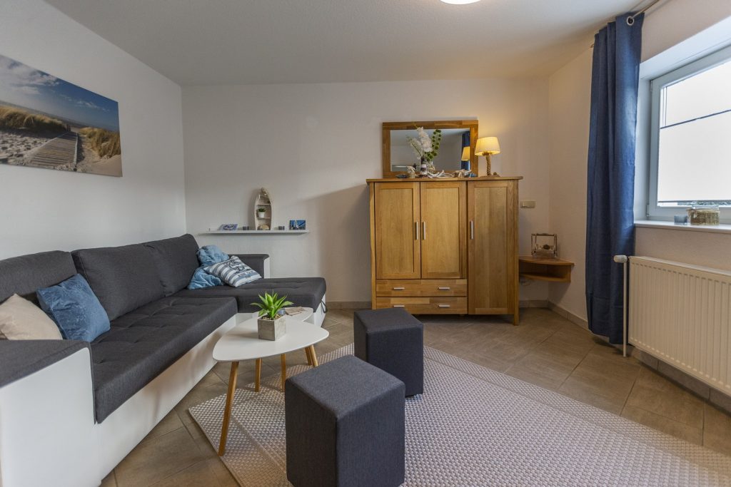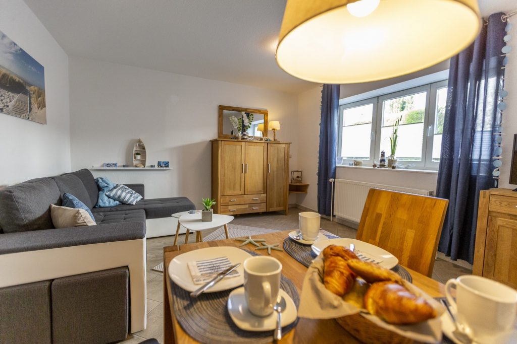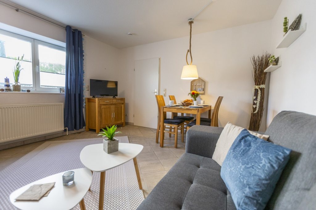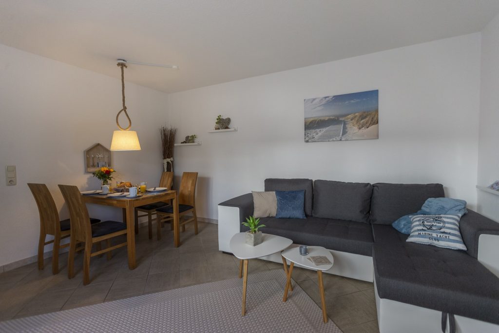 Der liebevoll eingerichtete Wohn- und Essbereich bietet eine Schlafcouch für max. 2 Personen (Liegefläche: 1,40 x 2,00m) sowie einen Esstisch für 4 Personen. Die maritime Dekoration schafft eine gemütliche Wohlfühlatmosphäre, so dass Sie sich hier auch bei schlechtem Wetter gern aufhalten. Am Abend sorgt ein Full-HD LED Fernseher mit digitalem Kabelfernsehen für Unterhaltung.
