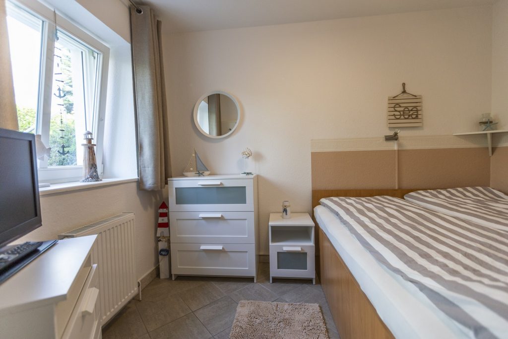 Die Ferienwohnung “Kleine Krabbe” liegt im Souterrain der Villa und ist über wenige Stufen erreichbar. Von dem Trubel der Strandstraße ist hier nur wenig zu hören.