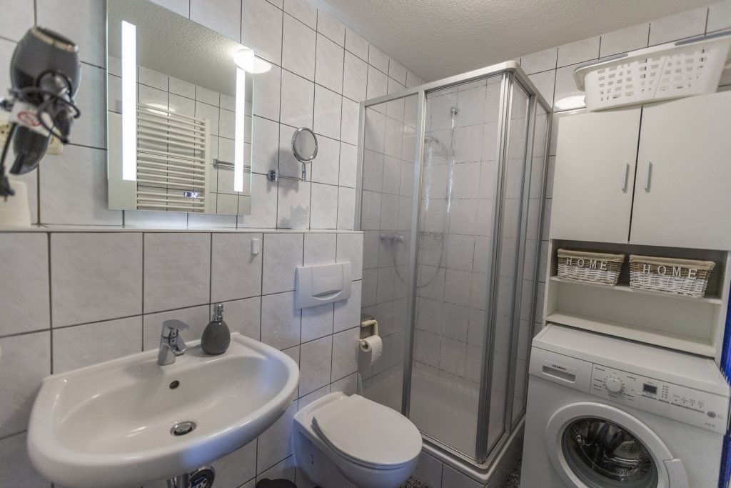 Im vollgefliesten Duschbad befinden sich neben Waschbecken, Dusche und WC eine Waschmaschine sowie ein Handtuchheizkörper, ein Fön und ein Schminkspiegel.