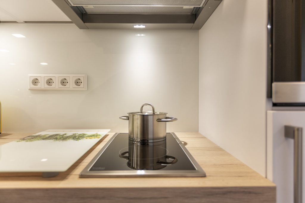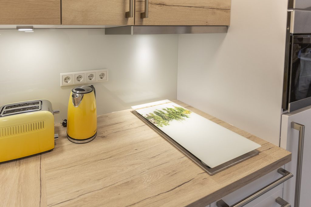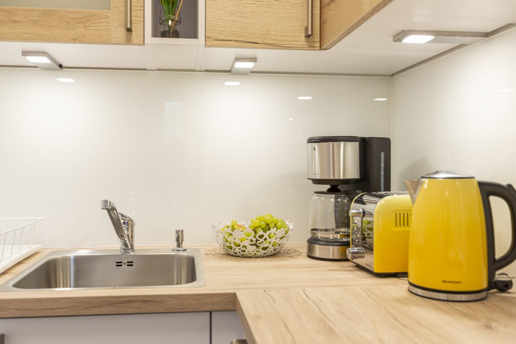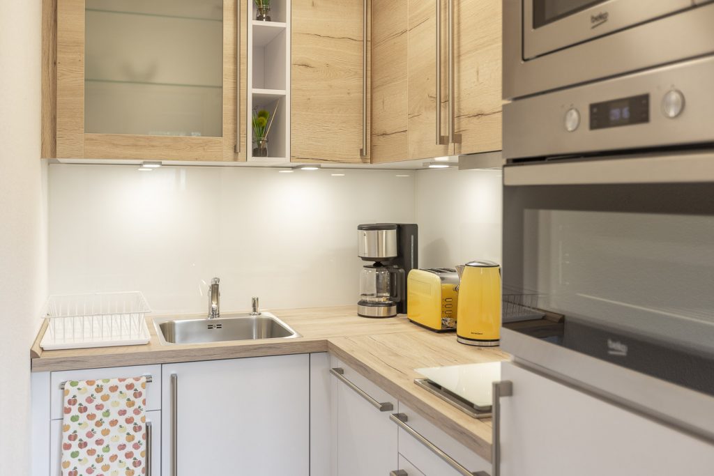 Die kleine, aber feine und funktional eingerichtete Küche verfügt über diverse Küchengeräte sowie über einen Backofen, eine Mikrowelle, einen Kühlschrank und einen Geschirrspüler.