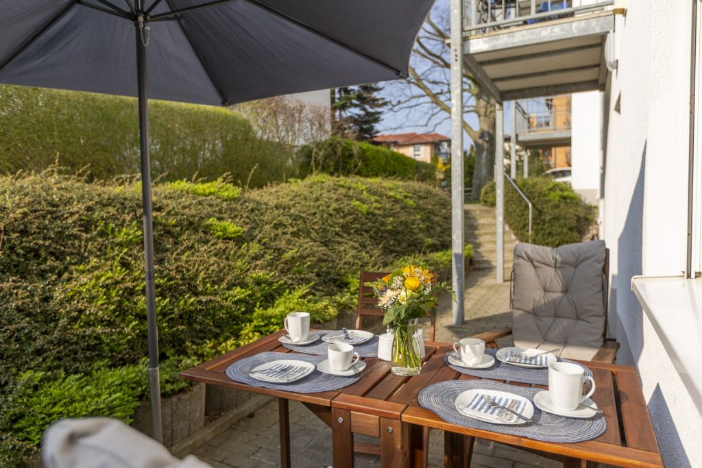 Die sonnige Terrasse der Wohnung ist von Grün umgeben und hat Süd-/West-Ausrichtung. Ein Sonnenschirm sorgt für ausreichend Schatten. Die Terrasse ist sehr ruhig gelegen und lädt zum Verweilen mit Kaffee und Kuchen ein. Die modernen Holzmöbel bieten Platz für 4 Personen.